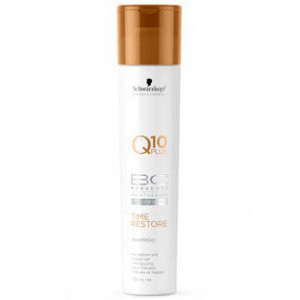 Champú Time Restore Bonacure Schwarzkopf 250ml con Q10 y Nutrifiller que son complejos que utiliza la línea de productos Bonacure Time Restore combina el Q10 con la tecnología innovadora Nutrifiller que elimina los signos de la edad visibles al instante, a la vez que estimula la síntesis natural de la queratina del cabello.